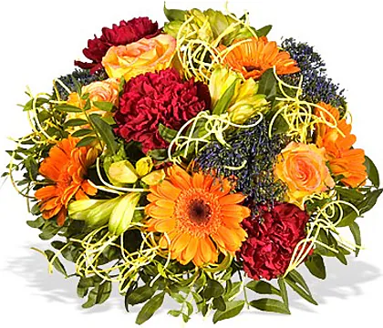 Bouquet de gerberas, rosas y claveles de tonos naranjas, enriquecido con detalles y pequeñas flores decorativas.