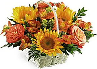 Cesta de flores en colores cálidos con rosas, girasoles, alstroemeria elegantemente decorado!